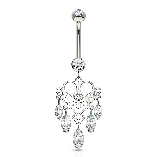 14kt chandelier heart CZ dangle marquise white gold belly ring. Beautiful sparkling chandelier marquise dangle cubic zirconia gems. 14 Gauge. 3/8" ...