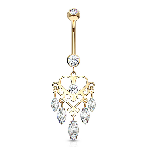 14kt chandelier heart CZ dangle marquise solid gold belly ring. Beautiful sparkling chandelier marquise dangle cubic zirconia gems. 14 Gauge. 3/8" ...