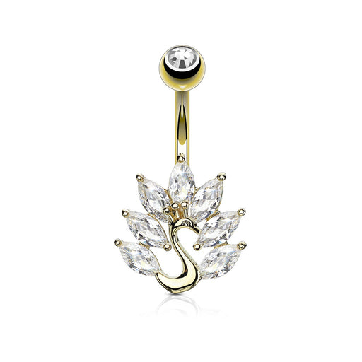Gold Plated Marquise Peacock Belly Ring. Gorgeous Cubic Zirconia gems surround this beautiful bird. 14 GA. 3/8" barbell. Gold Plated material. 5mm ...