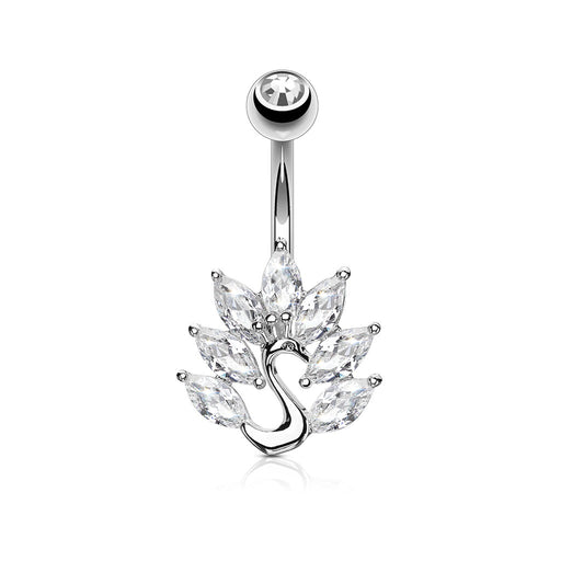 Marquise Peacock Belly Ring in silver. Gorgeous Cubic Zirconia gems surround this beautiful bird. 14 GA. 3/8" barbell. 316L surgical steel material...