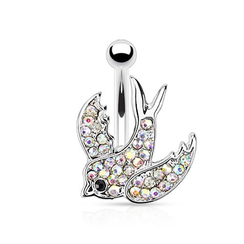 This adorable little bird is the perfect fit for any day! It's iridescent paved gems give a ton of sparkle and the style in this non dangling belly...