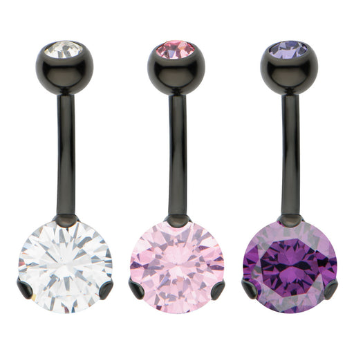 This 14G 3/8" black PVD coated navel barbell with prong set gem is available in three colors; clear, pink and purple. This one is simply irresistib...