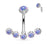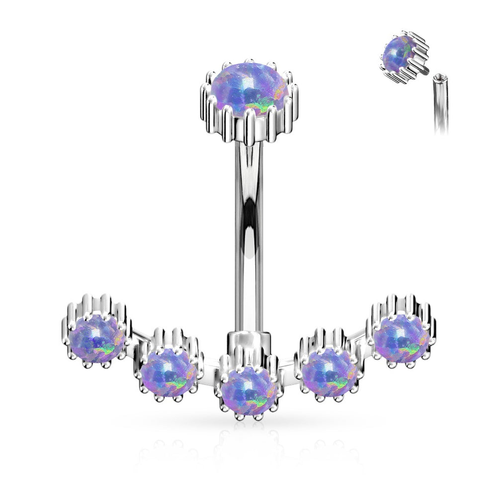 Opal Curved Line with Internally Threaded Opal Top Belly Ring. 316L Surgical Steel material. Synthetic Opal Naval Ring. A great piece that you can dress up or dress down. Opals have a iridescent shine. Line of opals are 3/4" wide. 14 GA. 3/8" barbell. 5mm ball. Available in: White, Blue and Purple.