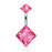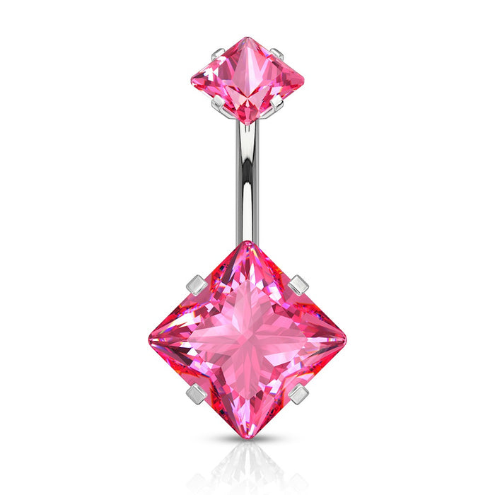 Square CZ Prong Set Internally Threaded Top Double Jeweled Belly Ring. 316L Surgical Steel. Cubic Zirconia gems available in: Clear, Rose Gold, Purple, Aqua, and Pink. So much sparkle! 14GA. 3/8" barbell. 5mm X 8mm.