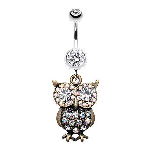 Bronze Owl Sparkle Belly Ring. Adorable boho owl with irredescent and clear crystals. It sparkles and it shines! Total length dangling is 1". Owl c...