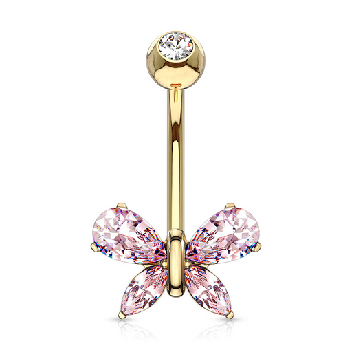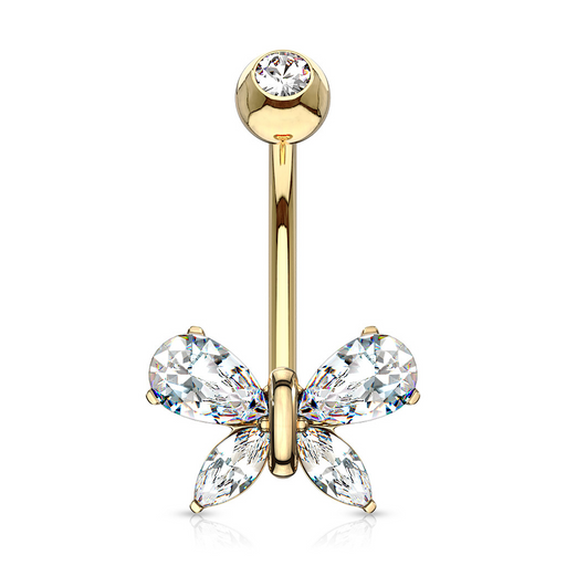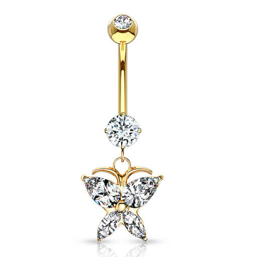 Gold 316L Surgical Steel CZ Butterfly With Double Round and Marquise Prong Set CZ Dangle This beautiful butterfly belly button ring is unique, sexy...