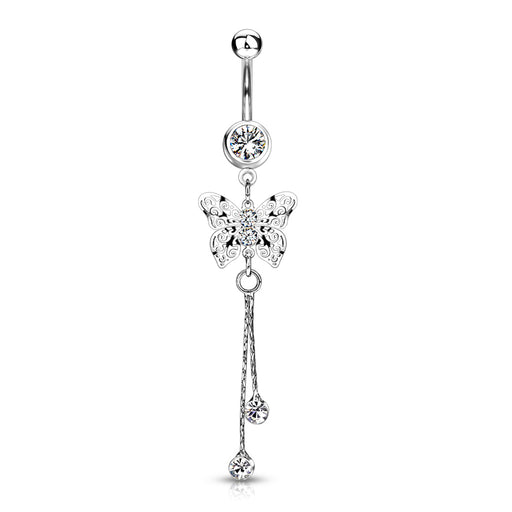 Silver 316L Surgical Steel CZ Butterfly With Double Round and Marquise Prong Set CZ Dangle This beautiful butterfly belly button ring is unique, se...
