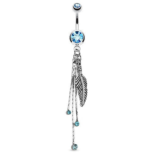 Long Dangle Leaf Belly Ring- 14 Gauge- 3/8" Barbell Length- 316L Surgical Steel- Long dangle featuring a wrapped silver leaf and 3 chains with aqua...