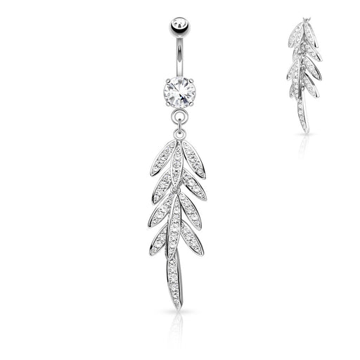 Pave CZ Leaves Dangle 316L Surgical Steel Belly Button Navel Ring. Shiny silver with sparkling cubic zirconia clear gems! Hangs beautifully. Delica...