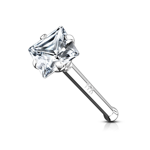 14 Karat Solid White Gold with 2mm Square Gem Top Nose Screw. 20GA. 5/16" bar length. Real Gold. Stamped with 14K on the bar.