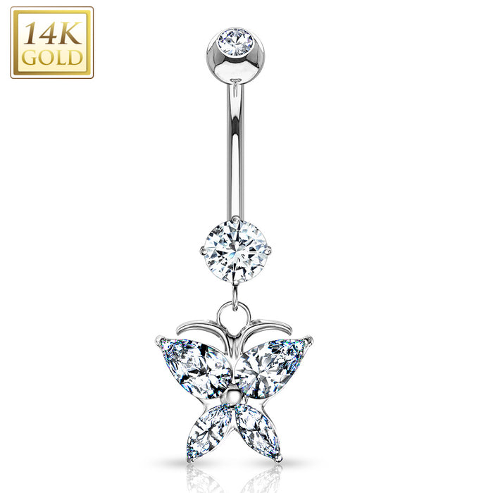 Marquise Butterfly CZ Navel Ring 14 Karat Solid White Gold. 14K Gold Belly Rings are the top of the line and the shine is spectacular. 14kt body jewelry is a must have for any belly ring collection! Treat yourself or a loved one with the best. Butterfly and beautiful clear gems. 14GA. 3/8" barbell. 4mm ball top. Also available in solid yellow gold.