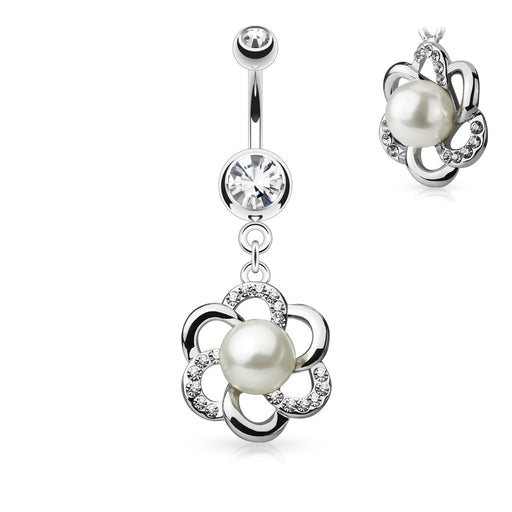 Pearl Centered Crystal Set Flower Dangle 316L Surgical Steel Double Jeweled Belly Button Navel Ring. Pearls and flowers are a great combo! Add a li...