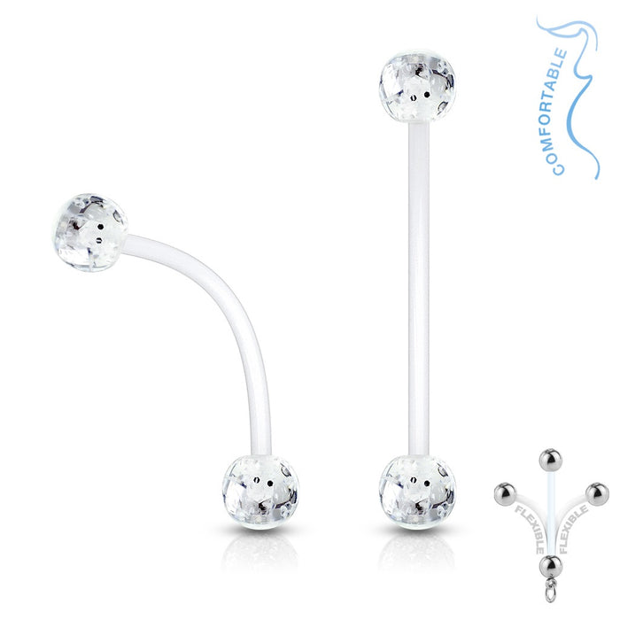 Glitter Ball Belly Ring for Pregnancy. Comfortable and will grow with your bump! 6mm glitter balls on each end. 1" flexible bar. 14GA thickness. Available in: Purple, Pink, Blue, Clear and Red.