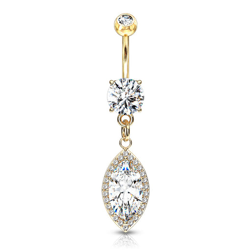 Gold 316L Surgical Steel Belly Ring With Pave CZ on Double Ring and CZ on Top and Bottom of the Rings The dangle paved cubic zirconia ring accente...