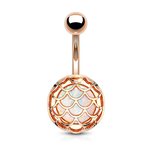 Opal Glitter Incased Casted Fish Scale PVD Over 316L Surgical Steel Belly Button Navel Ring. Sparkling gold color shimmering with iridescent colors...