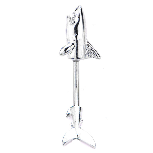We can hear the Jaws music now! The In and Out style shark naval ring is 7/16" and 14G and a whole lot of action! 316L Surgical Steel.