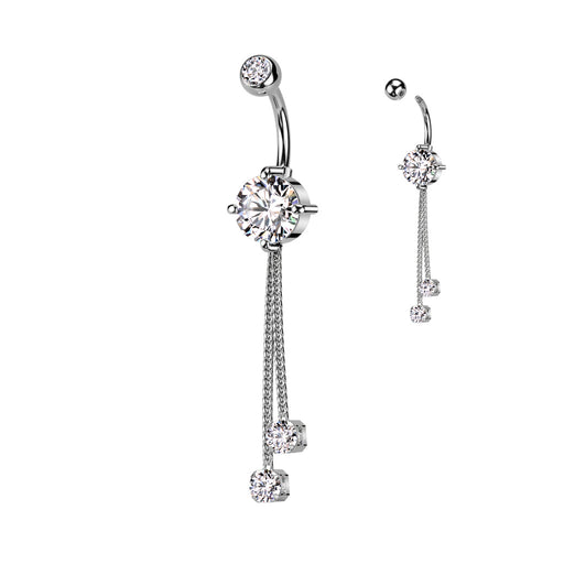 Silver 316L Surgical Steel Double Jeweled CZ With 2 Rope Chain Dangle Belly Button Ring Double-gemmed belly button ring with double rope dangles wi...