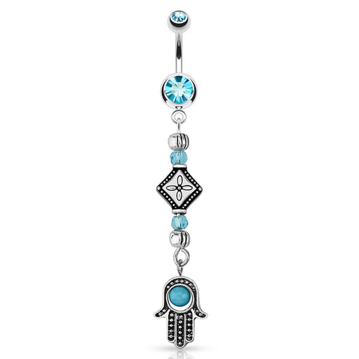 Need a little magical protection from the envious or evil eye? The popular Hamsa sign belly ring features turquoise tribal beads and dangles at 1 3...