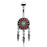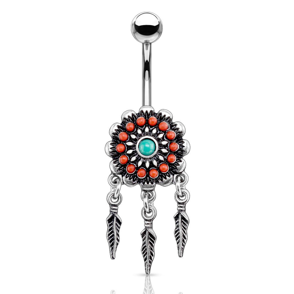 Tribal Flower with Turquoise Center and Feather Dangles. 316L Surgical Steel Belly Button Navel Ring. 14 GA. 3/8" barbell. 5mm ball top. Red and turquoise colors give this cool piece a great antique finish. Dreamcatcher style.