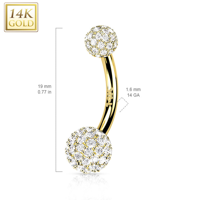 Gorgeous Ferido 14K Solid Gold Swarovski CZ paved ball belly ring. Dazzling 14k real gold belly rings are absolutely stunning. Enjoy the luster of brilliant 14k gold belly rings. 14 Gauge. 3/8" length. 4mm and 6mm ball sizes. 14k Gold Belly Rings. Clear Cubic Zirconia. 14Kt. Engraved On The Bar.
