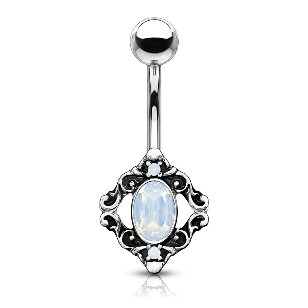 White Opalite Antique Filigree Belly Ring. 316L Surgical Steel Belly Button Navel Ring. Vintage look with Semi Precious Stones. A really cool look for a festival or a day out! 14GA. 3/8" barbell. Beautiful color with tons of detail and style.