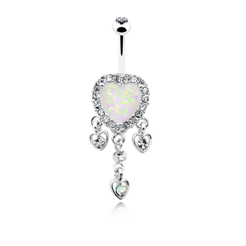 Heart opal dangle belly button ring. Three separate delicately dangling hearts fall beautifully from this opal heart with clear gems belly ring. 14...