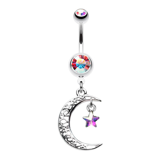 So much style and charm in this naval ring! The moon shines down and from it a tiny little iridescent star dangles. 14GA. 316L Surgical Steel mater...