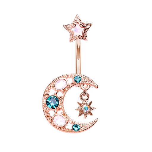 So much style and charm in this naval ring! Moon and stars with opals and teal gems all over a stunning rose gold plated belly ring. Cute little d...