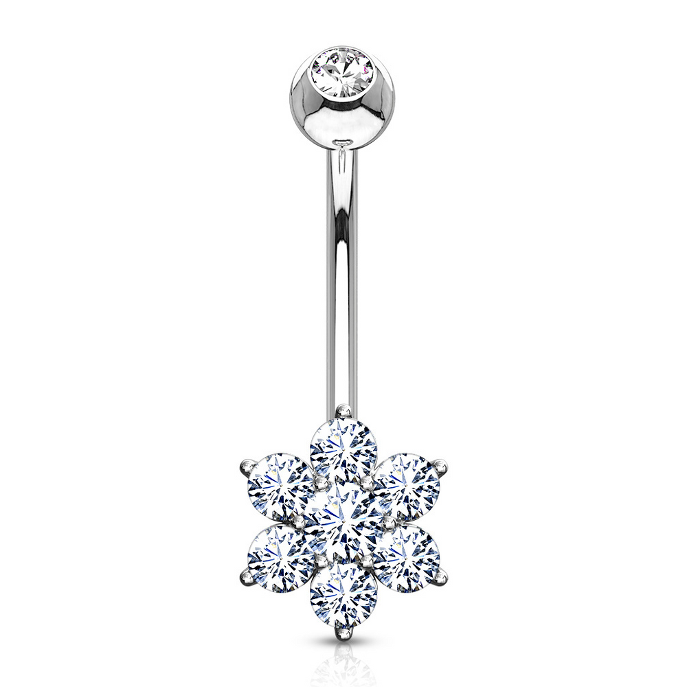 Gorgeous floral CZ white gold belly ring. This is a beautiful sparkling belly ring that is classy and stylish in every way. Simple and dainty CZ belly ring. 14K Real White Gold. 14 GA, 3/8" barbell. 4mm top ball. Also available in solid yellow gold.
