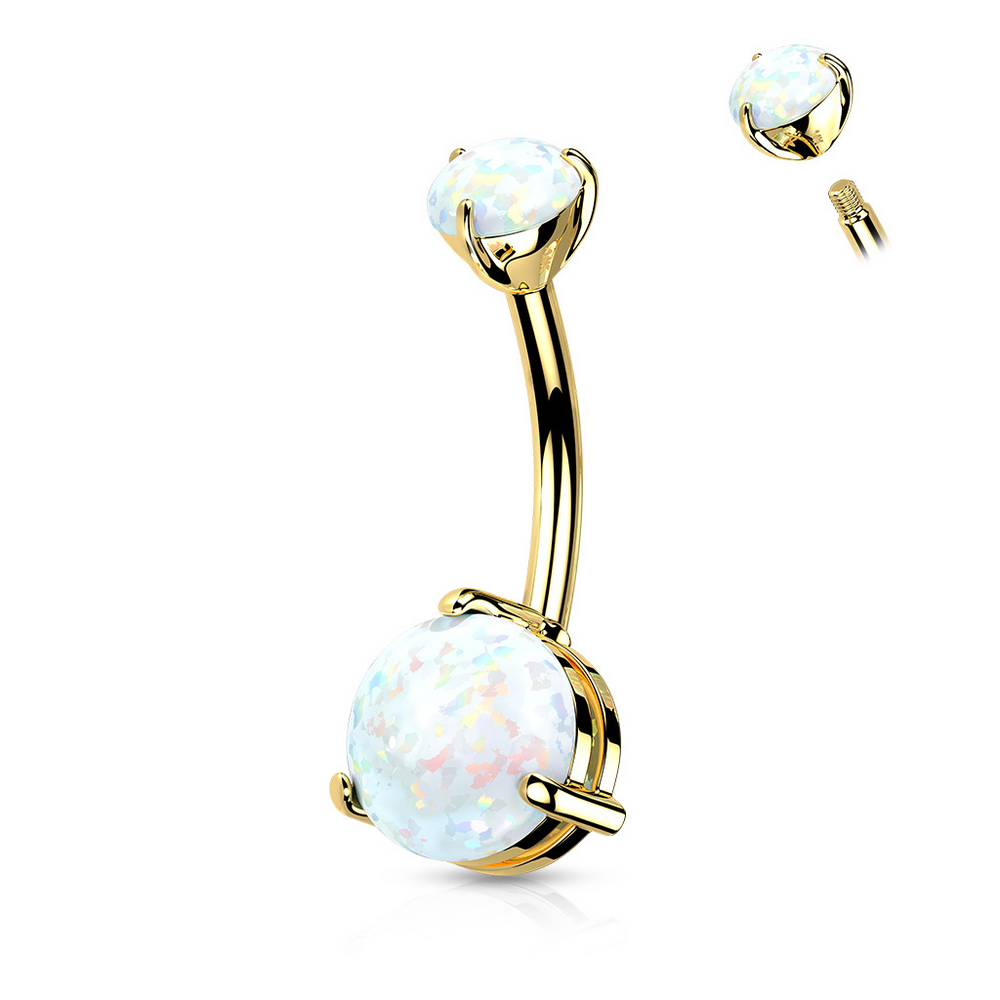 Beautiful 14k Solid Gold Opal Double Prong Naval Belly Ring. 14k real solid gold belly rings are absolutely stunning. Enjoy the luster of brilliant 14k gold belly rings. 14 Gauge. 3/8" length. 4mm and 6mm ball sizes. 14k Gold Belly Rings.