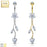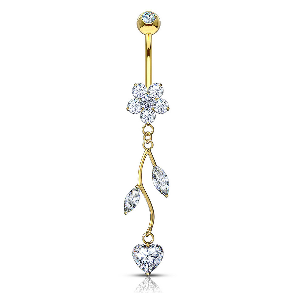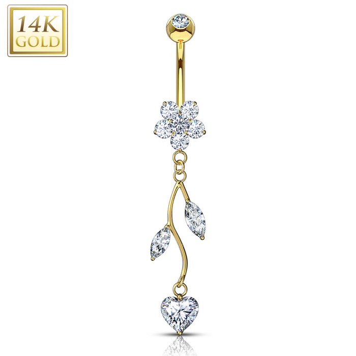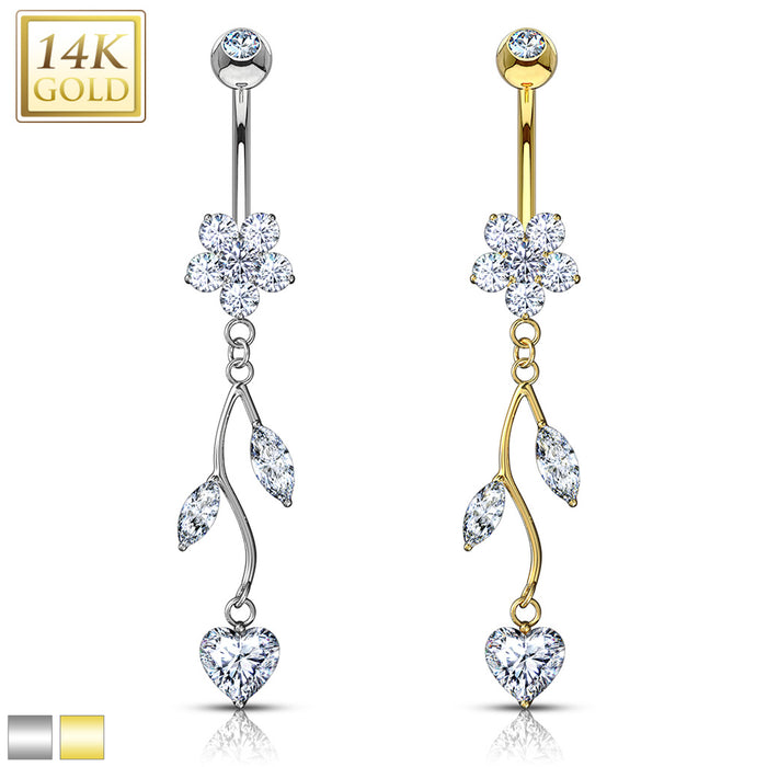 Cubic Zirconias Dangle from this 14K Flower Solid Yellow Gold Belly Ring. This is a beautiful sparkling belly ring that is classy and stylish in every way. This is a show stopper with gorgeous drop down dangling leaves and heart. 14K Real Gold. 14 GA, 3/8" barbell. 4mm ball. Also available in white gold.