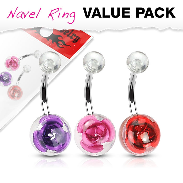 3 Pack Value Pack of Assorted Color Navel Rings with Metal Rose Embedded in Clear Acrylic Ball. 316L Surgical Steel material. Purple, Pink and Red. You get all three in this multi pack deal! 14 GA. 3/8" barbell.