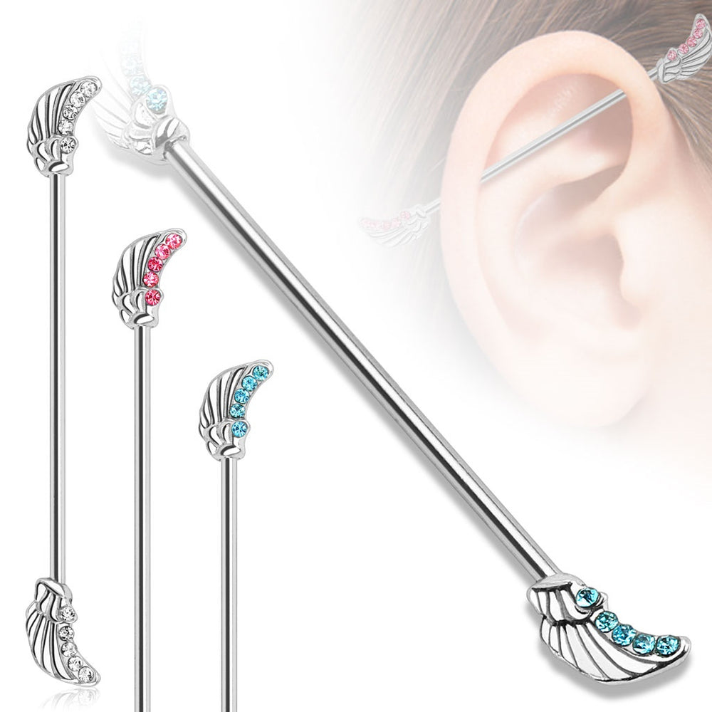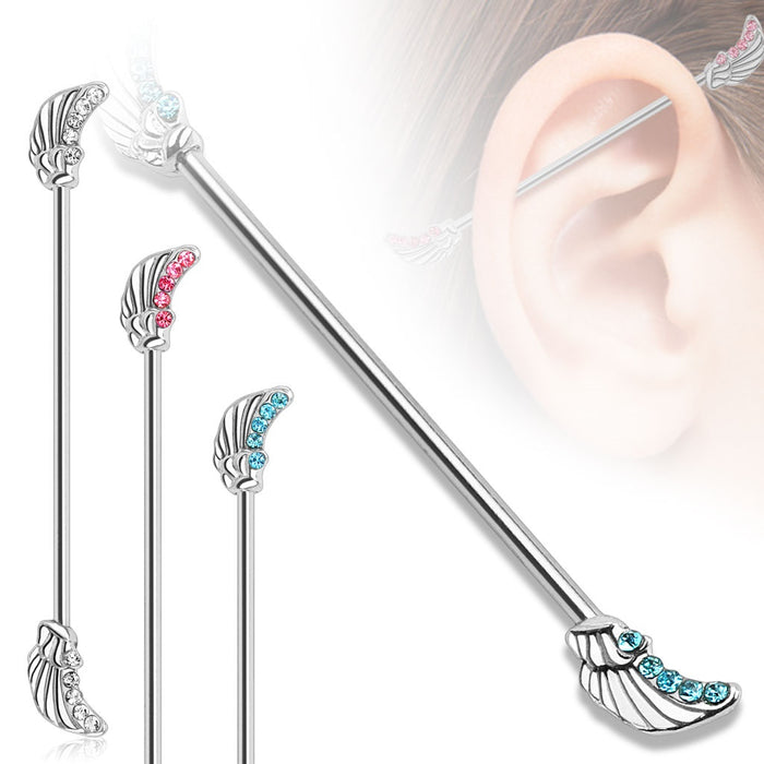 Angels Wings with Lined CZ Gems 316L Surgical Steel Industrial Barbell. Available in Clear, Pink and Aqua. Barbell length is 1 1/2". Total length is 2 1/8". 14 GA.