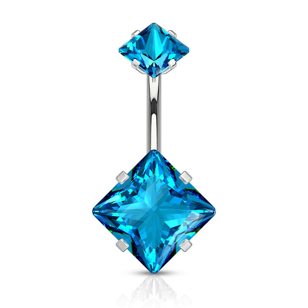 Square CZ Prong Set Internally Threaded Top Double Jeweled Belly Ring. 316L Surgical Steel. Cubic Zirconia gems available in: Clear, Rose Gold, Purple, Aqua, and Pink. So much sparkle! 14GA. 3/8" barbell. 5mm X 8mm.