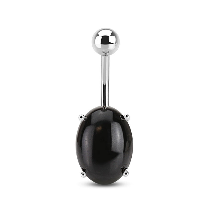 Black Agate Oval Semi Precious StoneProng Set Navel Ring 316L Surgical Steel. The color is gorgeous and the size is great! Stone has a silky luster navy blue color making this one a real beauty. Stone is 1/2" wide and 1/2" long. Non Dangle belly ring is 14 Gauge, 3/8" barbell.