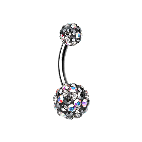 The colors are vibrant and beautiful in this one! Black and Iridescent gems sparkle all over! 5mm ball top X 8mm ball. 14GA. 3/8" barbell. 316L Surgical Steel Material. Check our our Ferido Belly Rings too!