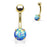 Opal Glitter Prong Set Gold IP Over 316L Surgical Steel Belly Button Ring in blue. Lots of sparkle and shine and perfect for the beach! 8mm synthetic opal. 5mm ball top. 14GA. 3/8" barbell. Opal belly rings are always popular! Add a little glitter and you're ready for anything! Available in: purple, pink, white, green, dark green, aqua, blue.