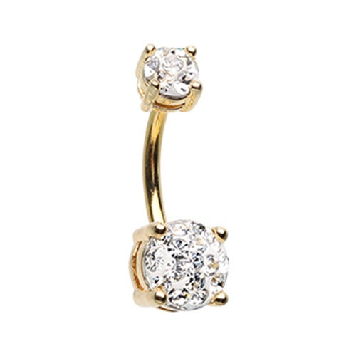 Golden Sprinkle Prong Set Belly Ring. Tons of sparkle and beauty in this classy naval ring! Gold Plated Surgical Steel material. 14GA. 3/8" barbell. 5mm X 8mm. Clear gems.