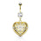 Crystal Set Tribal Net Heart Dangle 316L Surgical Steel Belly Button Navel Ring. Gold color. Hearts have never looked so perfect. So much detail and so much glam. The perfect mix of vintage and modern all wrapped up in one beautiful belly ring! 14GA. 3/8" barbell. Heart charm is 11/16" wide. Also available in Silver and Rose Gold.