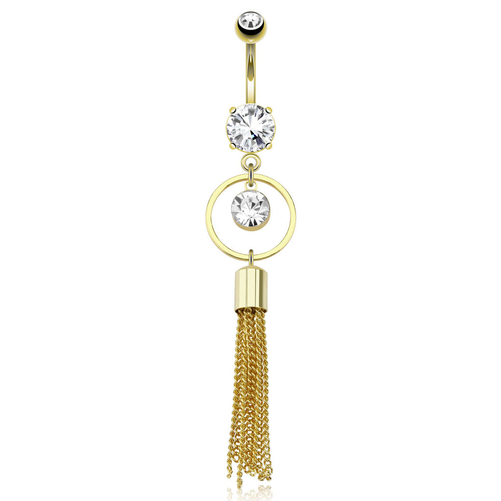 Large Round cubic zirconia Encircled by Round Ring with Extending Multi Chain Strings Dangling 14kt Gold Plated Navel Ring. A lot of glitz and glam in one belly ring! 14GA. 3/8" barbell.