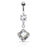 Mounted Diamond Shaped CZ with Paved CZs Dangle Navel Ring. Classic and timeless. Layers of sparkle delicately fall from a 4 pronged round cubic zirconia gem. Width of charm is 7/16" wide. 14GA. 3/8" barbell. Ball top is 5mm. 4 pronged CZ is 6mm. Simple and elegant.