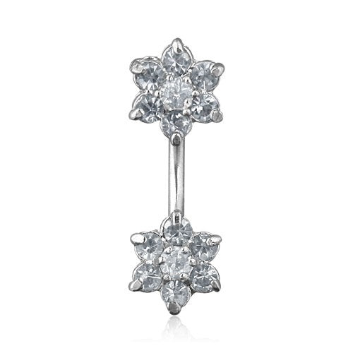 Two beautiful sparkling clear cubic zirconia gem flowers are on the top of bottom of this belly ring. So much style in one accessory. A must for your collection and your belly! 14GA. 316L Surgical Stainless Steel material. 3/8" barbell.