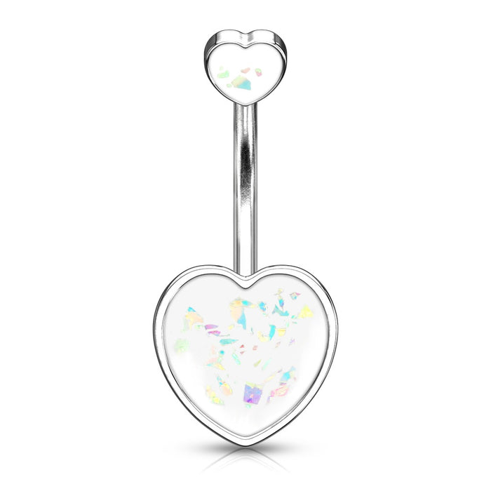 Double Opal Glitter Filled Heart Belly Ring. 316L Surgical Steel Belly Button Navel Ring. 14 GA. 3/8" barbell. A cute belly ring perfect for every day and all night long!