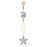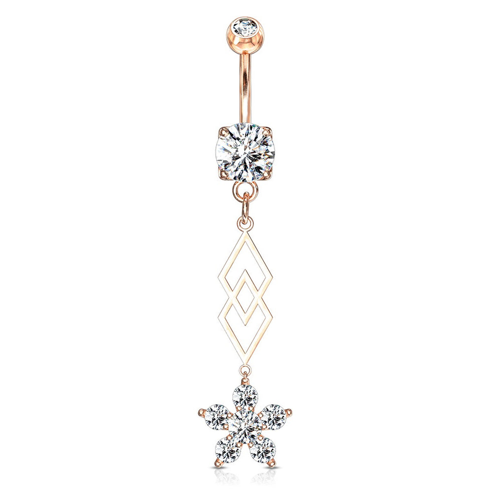Six CZ flowers and two overlapping diamonds Dangle 316L Surgical Steel Belly Button Ring. This one is glam! 1 1/2" of dangle! Rose gold plated. Prong set clear cubic zirconia gem. 14 GA.
