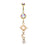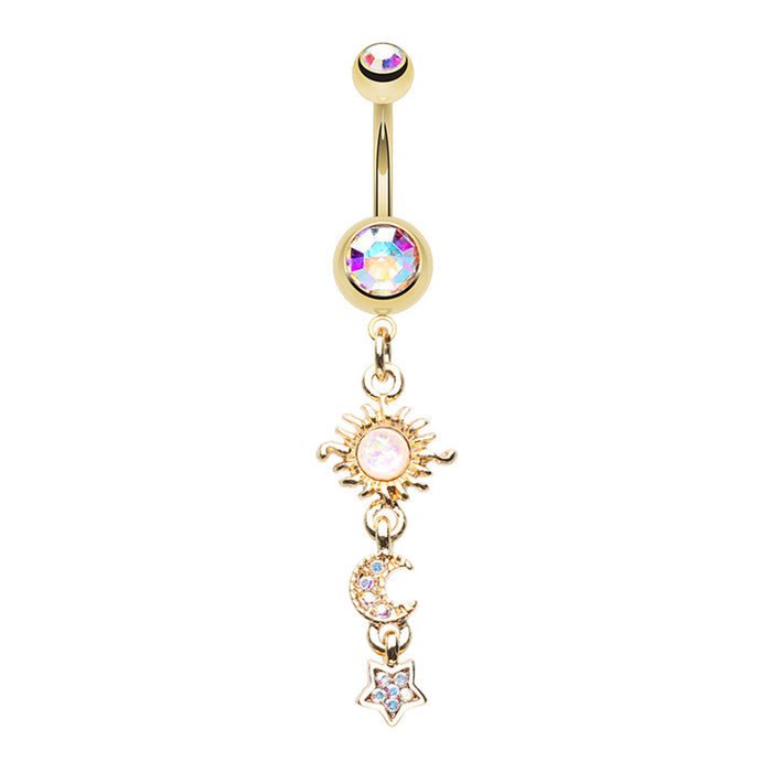 Golden Iridescent Celestial Sun Moon Star Belly Button Ring. Gold plated surgical steel material. Dangling belly ring. Petite charms dangle from an iridescent gemmed barbell. 14GA. 3/8" barbell.