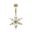 Golden Glistening Flower Belly Ring. You won't believe the sparkle and shine in this one! Flower is 7/16" wide. 14GA. 3/8" barbell. Gold plated steel material. Flower belly rings are perfect all year and a beautiful accessory to every outfit!