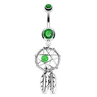 Catch your dreams and keep them close to your belly button with this fun green dreamcatcher belly ring. The green gems sparkle and the bright green bead in the center help you try to catch your dreams at the beach, pool, or anywhere!