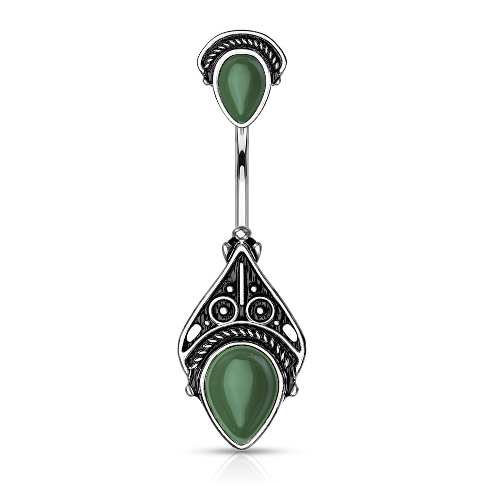 Vintage Filigree with Semi Precious Stones. 316L Surgical Steel Belly Button Navel Ring. A really cool look for a festival or a day out! 14GA. 3/8" barbell. Beautiful green color with tons of detail and style.