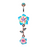 Vintage Boho Hawaiian Plumeria Belly Ring. The colors are fantastic in this dangling tropical flower belly ring. Total length is 2". Two colorful flowers hang from a vine with leaves. Aqua gems give it that extra shimmer and shine. Flowers, Vine and Leaf belly ring.