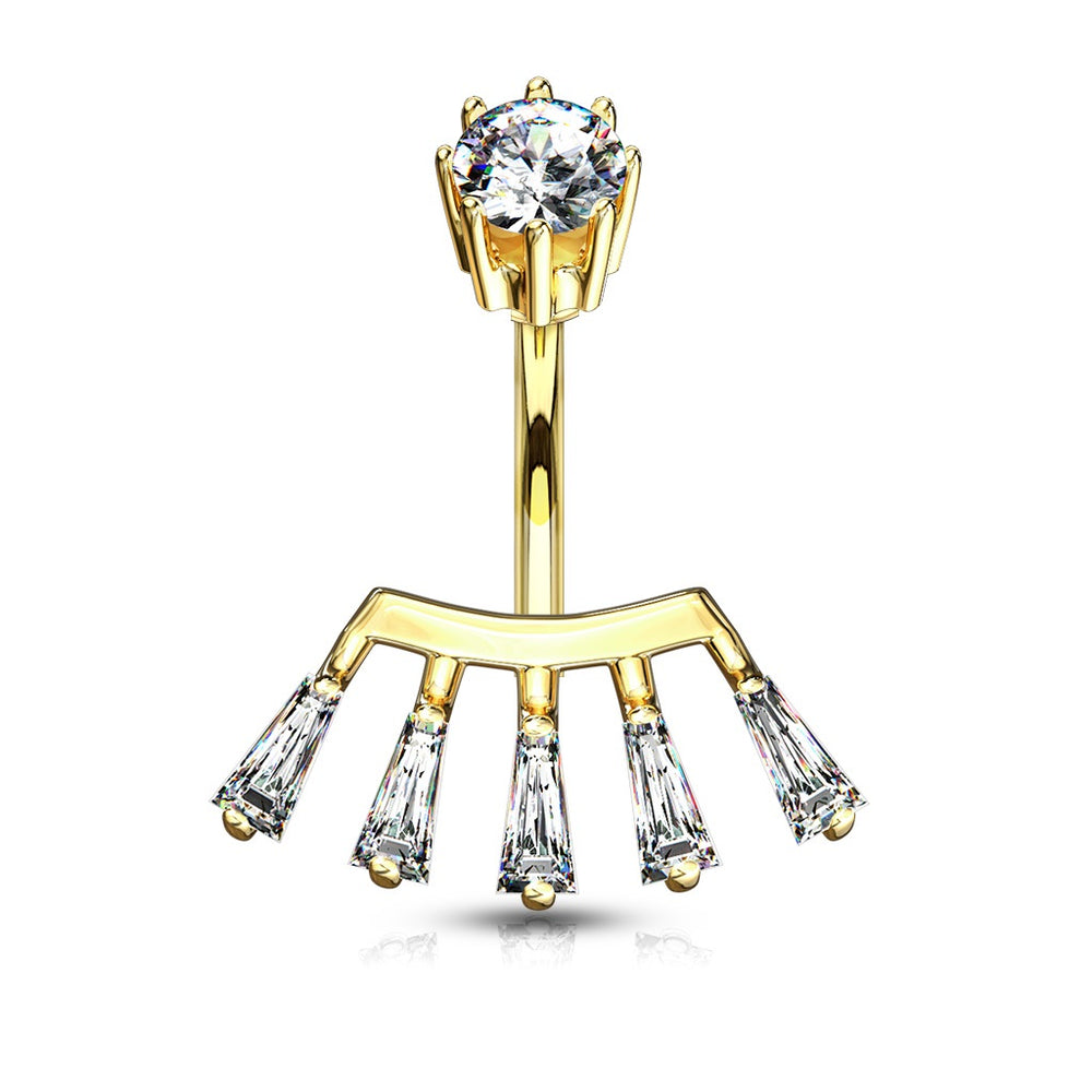 Princess Cut CZ Fan with Internally Threaded Crown Set CZ Top. 316L Surgical Steel Belly Button Ring. Available in Silver, Gold and Rose Gold. Elegant and sophisticated. 14 GA. 3/8" barbell.